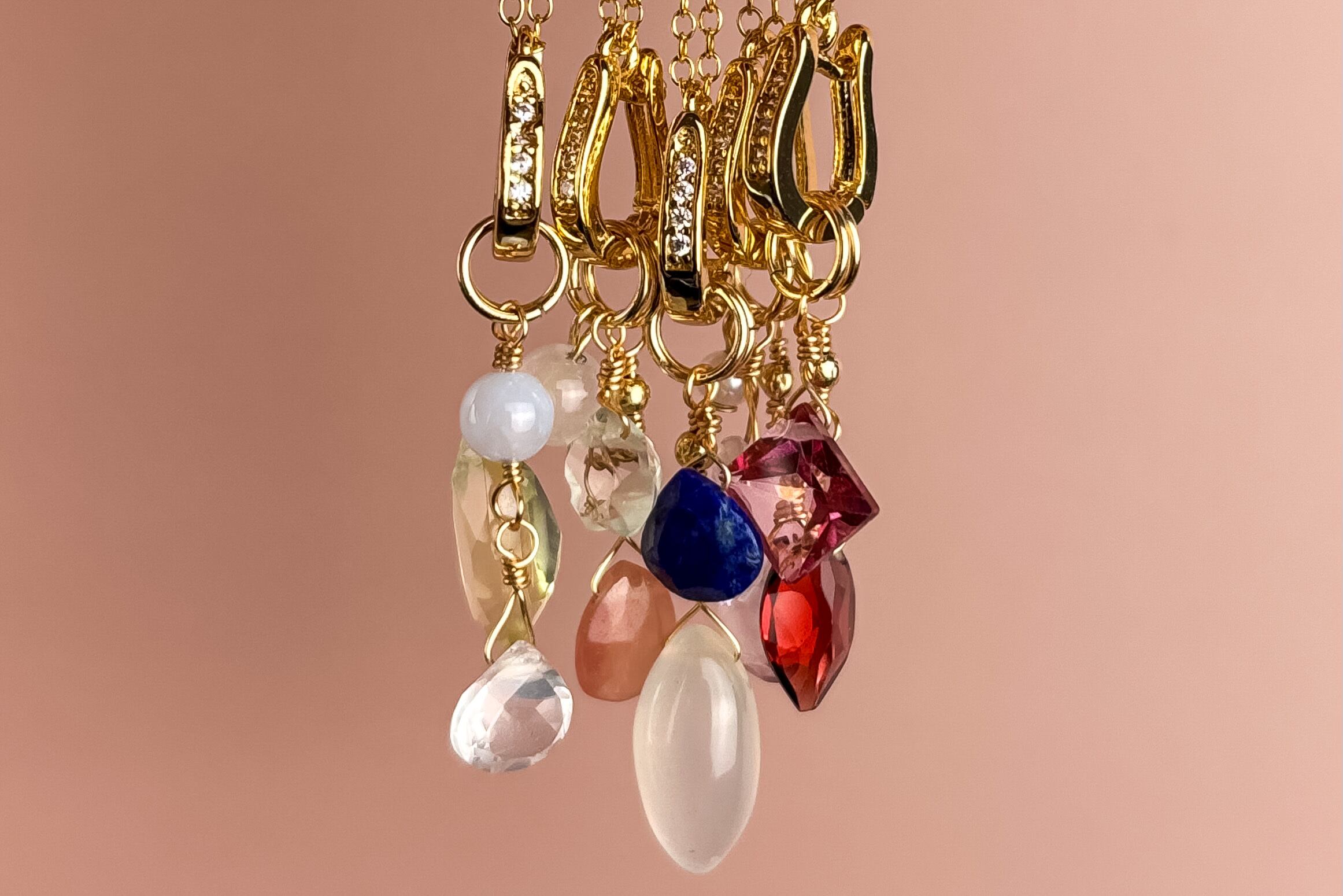 ローズクォーツやアメジストなどの天然石チャームを、ピアス・イヤーカフ・イヤリング・ネックレスへ自由に付け替え可能。オフィスでも休日でも上品に馴染むサイズ感が特徴です。