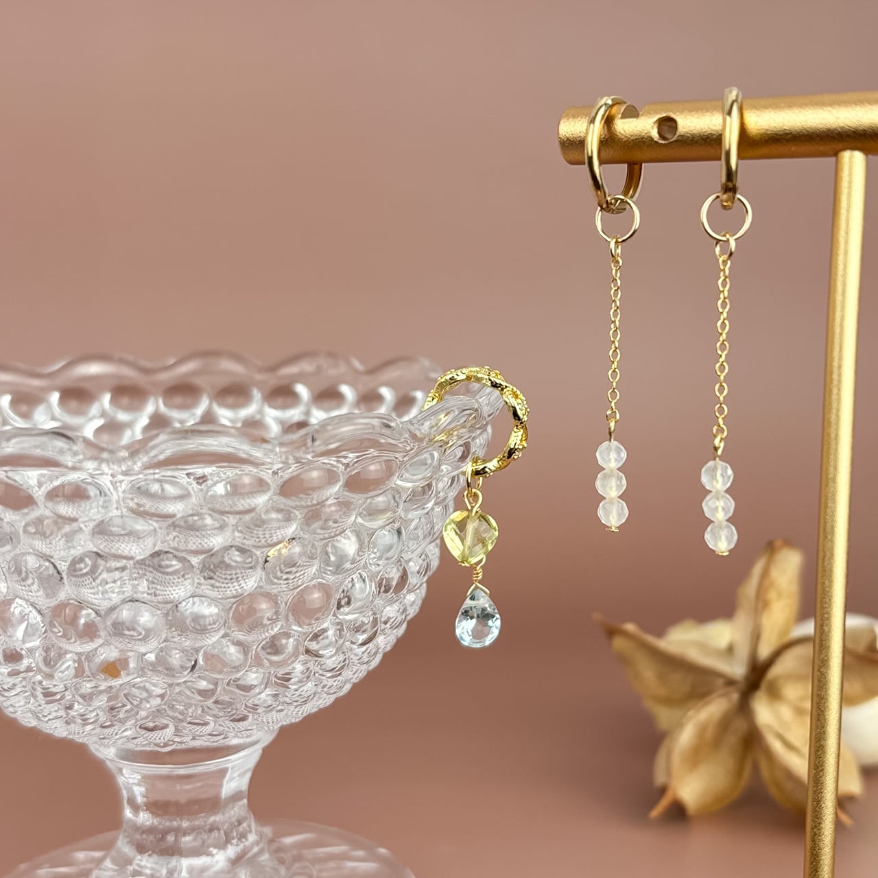 3つの天然石がつくる軽やかな透明感で、顔まわりを明るい印象へ整える付け替えチャームセット。
