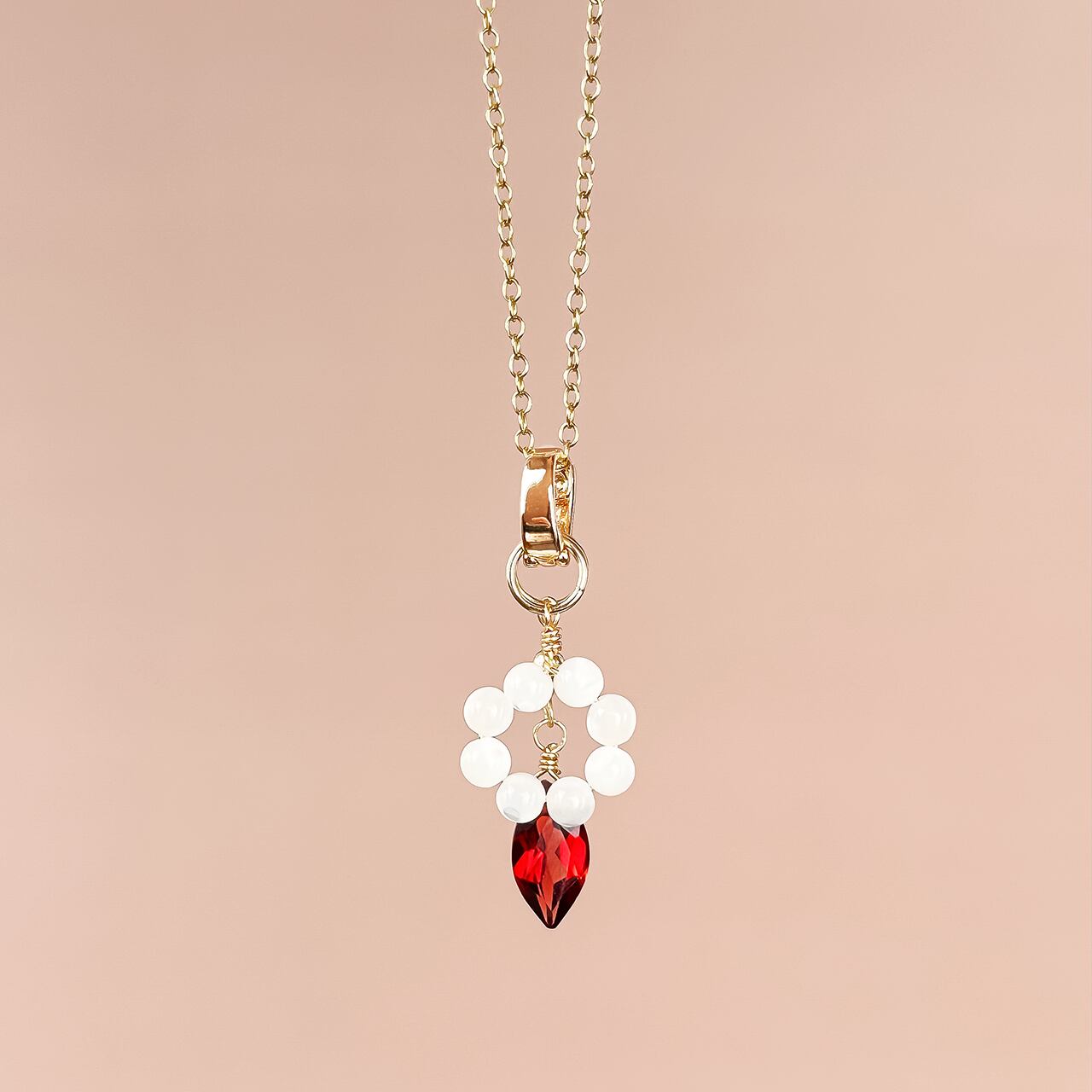 チャームをベイルに通したら、お手持ちのネックレスチェーンに取り付けて完成。チェーンに無理な力がかからない設計なので、繊細なチェーンでも安心して使えます。