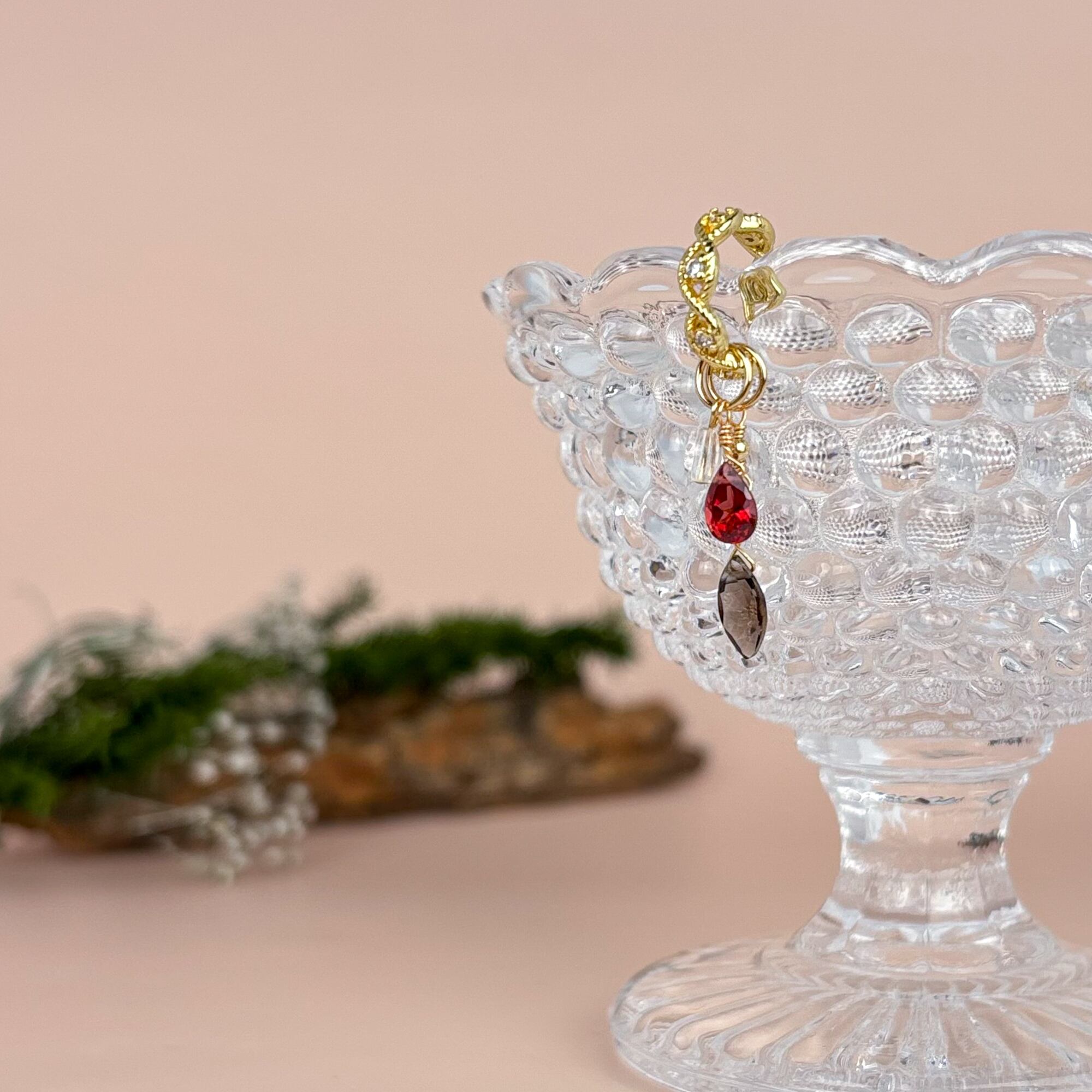 ガーネットの深い赤、クリスタルの透明感、スモーキークォーツのブラウン。