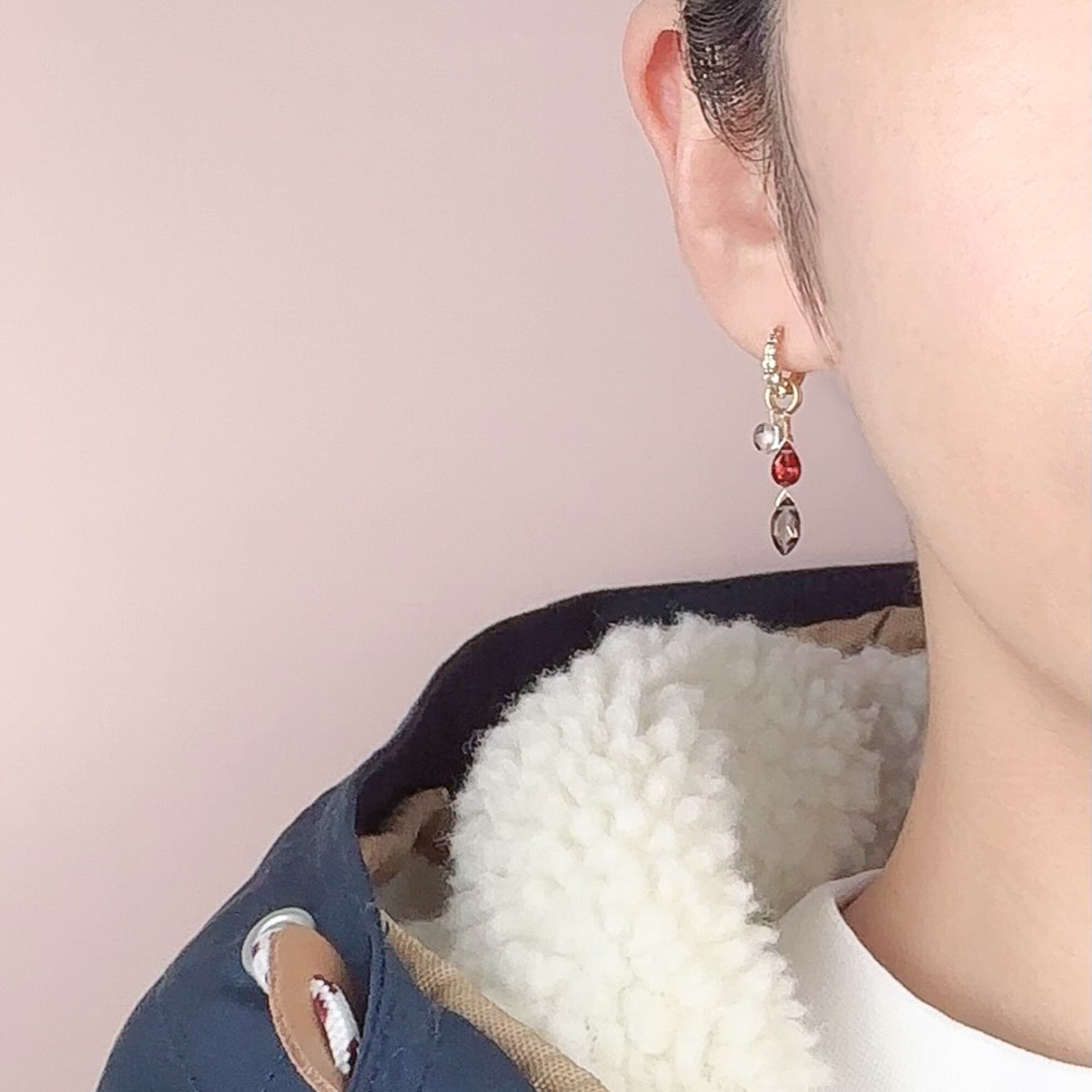 3色のコントラストが、耳元や首元でほどよく印象を締めます。