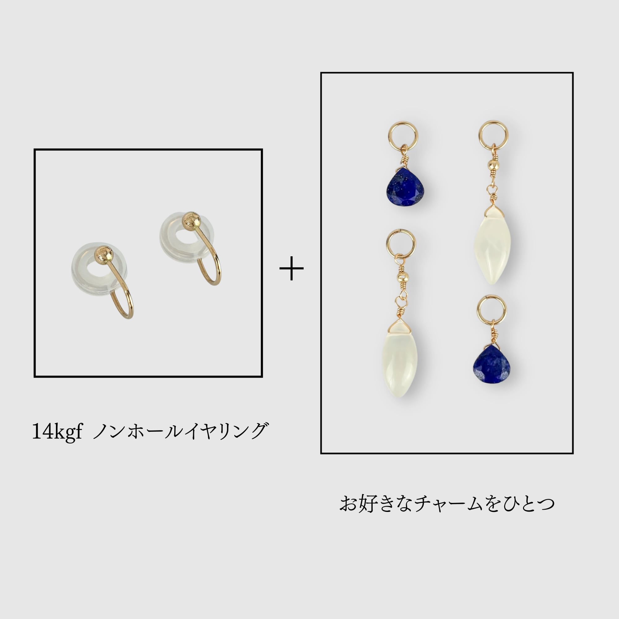 14kgfノンホールイヤリング(両耳用)と、お好きなチャーム1種類をお選びいただけるセットです。