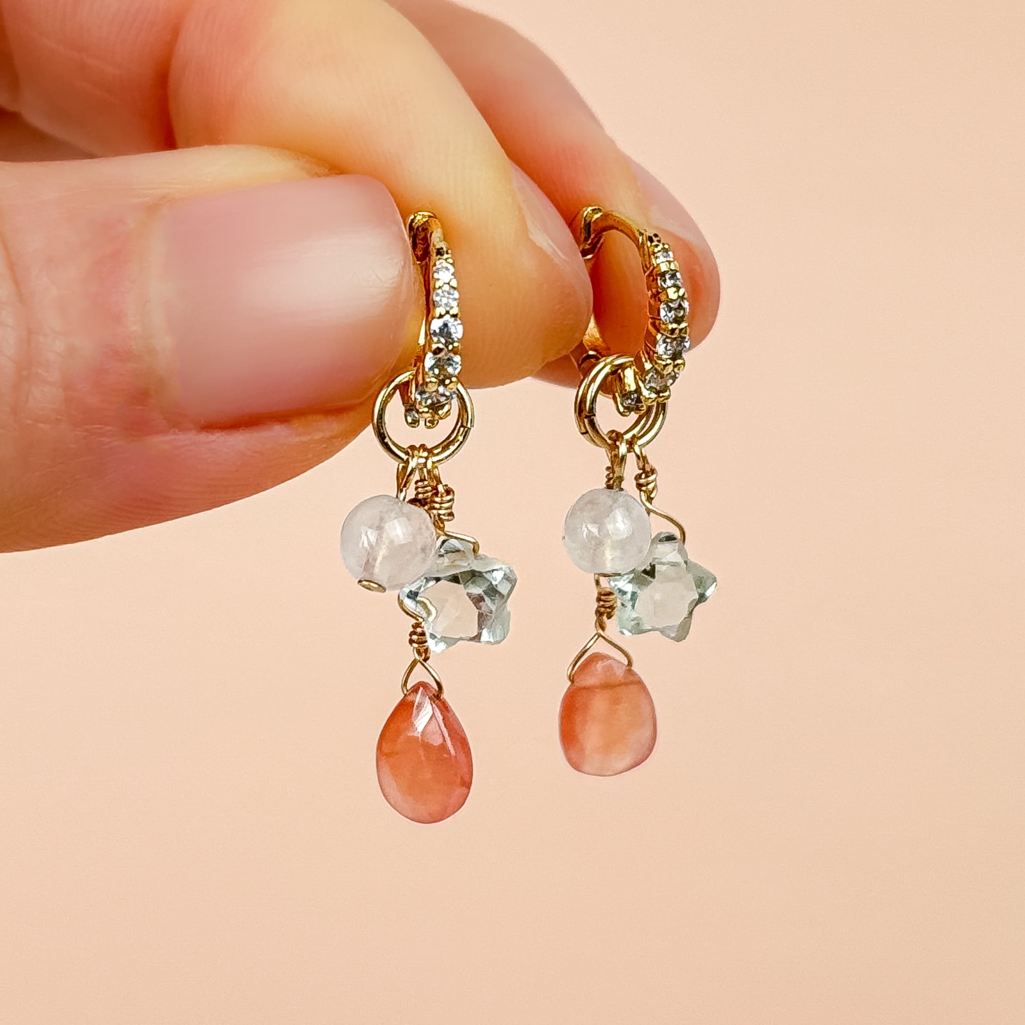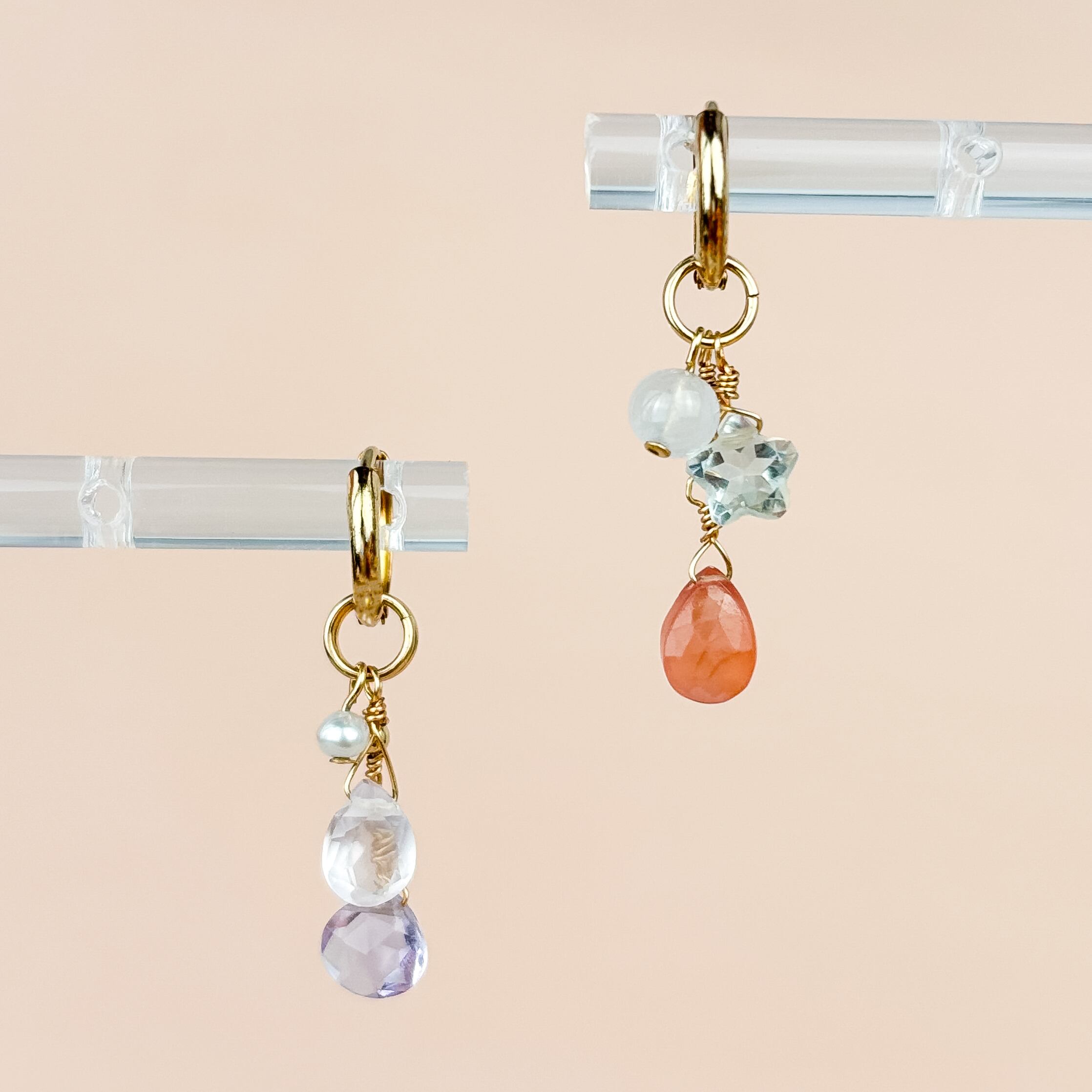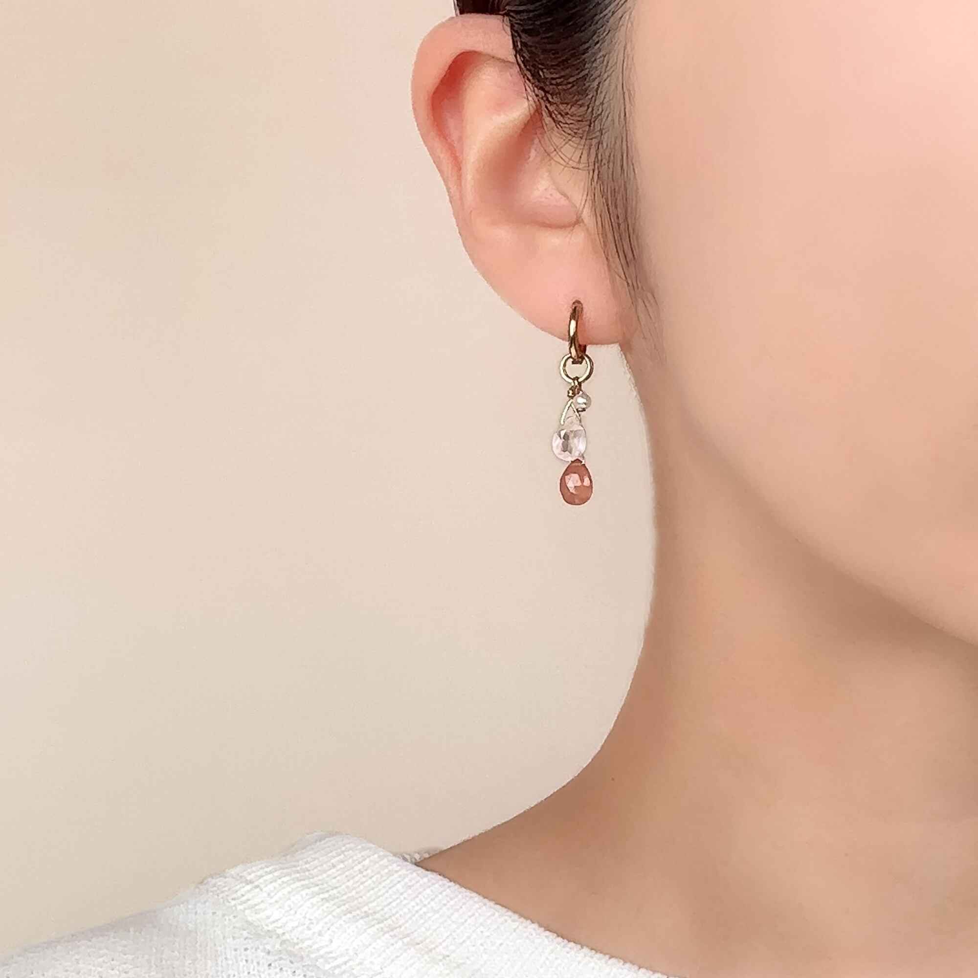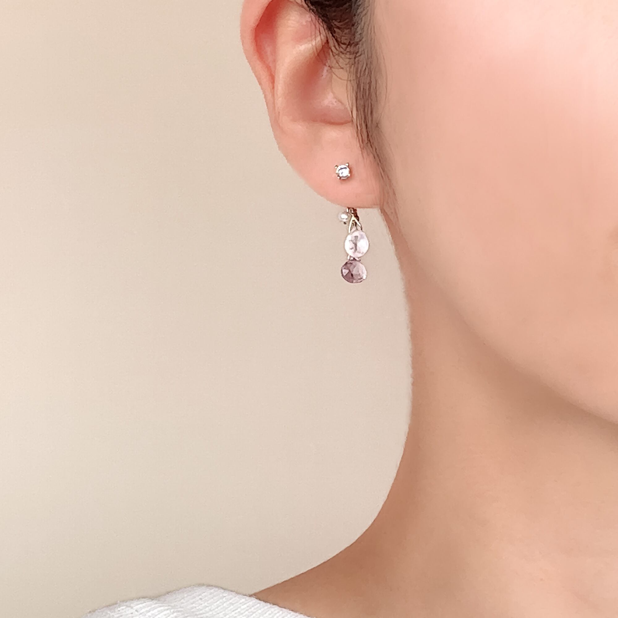 「やさしい気持ち」のピンク・パープル系に、「わたしのリスタート」のホワイト・グリーン・オレンジピンクが加わることで、耳元の配色に奥行きが生まれます。
